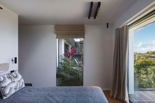 A double-story villa, ALOHA is an architectural gem set into the hillside. Its views over the ocean, Turtle Island and Grand-Cul-de-Sac lagoon are breathtakingly beautiful, and you’ll marvel at them from the bright living room furnished with a large, comfy sofa. The fully-equipped kitchen is located in the same space and can accommodate your private chef for any private event. You'll love dining al fresco under the covered terrace around the large dining table, close to the outdoor living room, also sheltered from the sun in the gentle trade winds. The whole setting is relaxing and quiet, for a unique and unforgettable stay with friends or family.