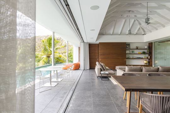 Built over two levels, villa BAKEA was built in a modern architecture and a sleek decor. Under the high vaulted ceilings, the spaces are bright in a refined decor. Furnished with large sofas and coffee tables, the living room is swept by the island’s mild air and opens onto the terrace with pool Through the bay windows, guests can admire the vegetation of St-Barths’ rolling hills. The dining room which can accommodate eight guests is located in the same open space close to the well-equipped kitchen with breakfast bar. A few hints of wood create a soothing atmosphere, ideal to enjoy the beauty of villa BAKEA's surroundings.