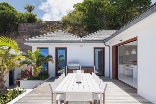 Built over two levels, villa CAP AZUR opens onto a beautiful panorama over the sparkling horizon, from Lorient to Anguilla. The air-conditioned living room welcomes guests in the very refined lounge with a large sofa and benches under the vaulted ceiling. The well-equipped kitchen features a fine dining area and a table for ten with contemporary-style white chairs. At the front, the wide windows open onto the amazing ocean view, and on the side onto the al fresco dining table on the terrace with barbecue, close to the TV lounge. Between sky and sea, the atmosphere is most peaceful and relaxing, in the mild breeze that blows through the tropical garden.