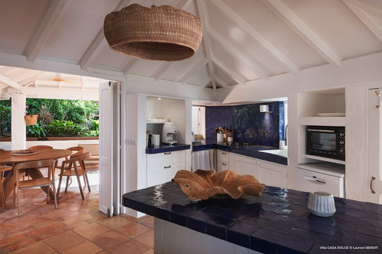 Built across multiple levels, CASA DOLCE was recently renovated in a lovely style with both Caribbean charm and the clean, cozy elegance of modern indoor spaces. Designed with several bungalows, this luxury vacation rental in St-Barts is divided into distinct spaces, each offering stunning views over the lush vegetation and well-appointed terraces. In the main building, the lounge welcomes you with cozy banquettes and green cushions, creating a warm and bright ambiance enhanced by mirrors and stylish lighting fixtures. You’ll love enjoying delightful movie nights watching the large TV screen, with the gentle trade winds blowing through the open spaces. Nearby, the open-plan, fully-equipped kitchen connects seamlessly to a covered terrace featuring a beautifully arranged dining area, between indoor and outdoor spaces. In the soothing Caribbean air, the serene and elegant atmosphere of CASA DOLCE is the perfect setting for relaxing, idyllic vacations.