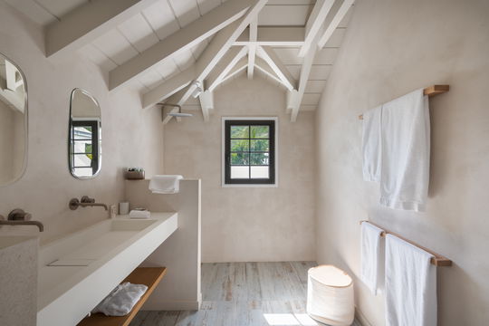 The vacation rental COLETTE consists of six air-conditioned en-suite bedrooms. In the main building, you’ll find four bedrooms. One is on the first floor with sea view and access to the rear terrace, and the three other ones are on the first floor accessible via a staircase, two of which feature a terrace with sea view and one with view over the interior terrace. The other two bedrooms are in a separate building for utmost privacy, with one bedroom on the main level and another one upstairs, the latter with twin beds.