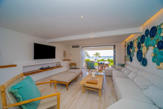 Built over two buildings connected by a heated pool and surrounded by very private terraces, the vacation rental COLETTE offers beautiful views over the beach and Corossol harbor. The air-conditioned living room opens onto the elegantly appointed terrace and the sparkling waters. The long sofa, banquettes, cushions, HDTV and turquoise-blue decor in a cream-colored setting create a soothing, peaceful and relaxing atmosphere. Close to it, you’ll find the well-equipped kitchen with central island, in an enchanting scenery as the trade winds blow over St-Barths.