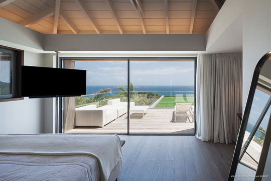 The sumptuous vacation rental FELICITY is composed of seven air-conditioned bedrooms with king or queen size beds and en-suite bathrooms. They are spread over three levels on several buildings, and open onto magnificent ocean views; the seventh room, ideal for staff or for a teenager, opens onto a beautiful view over the hills. An elevator is also at your disposal to reach the other levels with greater ease and comfort. Sports lovers will appreciate the air-conditioned fitness room with upscale equipment.