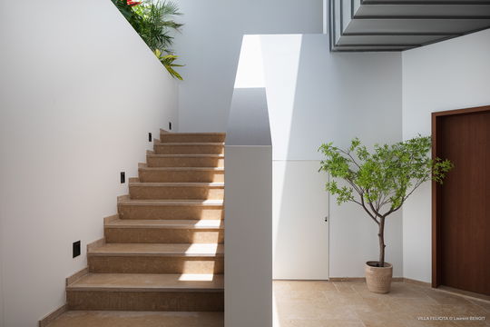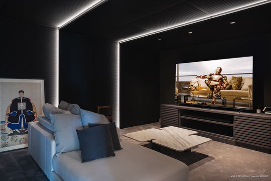 Built on three levels over several buildings, the luxurious villa FELICITA is a true architectural gem. In a contemporary style and a decoration by the famous designer Jean-Michel Wilmotte, this house opens widely onto the ocean and offers upscale equipment in a very refined setting. The large living room furnished with sofas, armchairs and off-white-colored benches in a chic atmosphere lets the gentle trade winds blow in. The dining room can accommodate up to twelve people around a large indoor dining table, where guests can enjoy meals prepared by a private chef in the well-equipped professional kitchen. And for idyllic evenings under Saint Barths’ sky, there are a playing area with a foosball table as well as a cinema room perfect for movie nights in a cozy atmosphere.