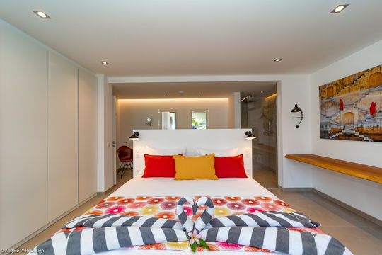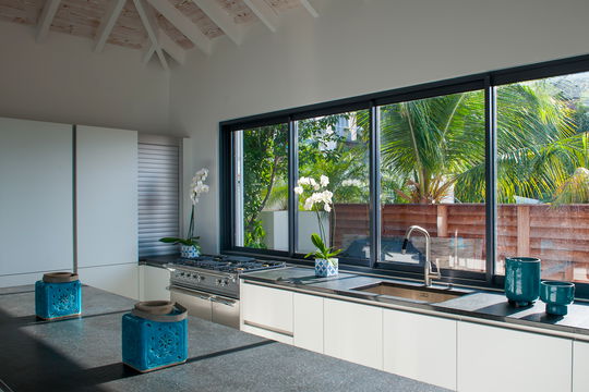 The luxurious vacation home FEYROUZ has five cozy air-conditioned bedrooms, each of which with an en-suite bathroom. All five suites have king size beds and are tastefully decorated. Two of them offer a view over the garden and the great room, while two others open onto the hills and are located on a lower floor, accessible by stairs from the living room. The fifth room is on the upper floor of the property and is in an independent bungalow. This is a fully functioning studio-apartment with a private terrace, an ocean view as well as a kitchenette for utmost autonomy and privacy during your stay in Saint-Barths. The beautiful holiday villa FEYROUZ in Vitet is a modern, airy and welcoming property, ideal for your next vacation with family or friends in St-Barths.