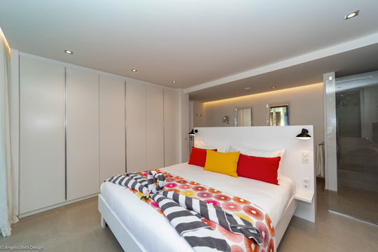 Recently renovated, the luxurious villa FEYROUZ is built on three levels on the hillside. On the main level, the large and open-plan great living room and the comfortable lounge are furnished with cozy sofas and armchairs. Designed to enjoy the magnificent scenery, the decoration is sleek and bright, and the high whitewashed vaulted ceilings mixed with colorful hues create a serene and soothing atmosphere.