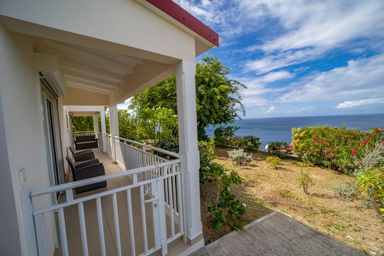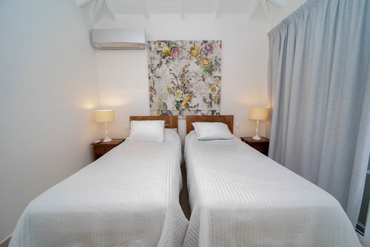 The vacation rental home GROS ILETS has two beautiful air-conditioned bedrooms located on a lower level of the villa, with ocean and garden views. One of them is furnished with a king size bed, while the other one has twin beds that can be converted into a king. Both have their own private bathroom for utmost privacy.