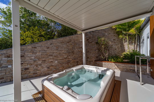 At the front of the villa, the terrace features a splendid heated infinity swimming pool, perfect for relaxation facing the azure horizon of the endless ocean. Sun loungers are arranged around the pool for delightful sunbathing sessions. Under the shaded gazebo, take time to chill on the very comfortable benches covered with cushions, lulled by the trade winds. In the lush tropical environment, you’ll marvel at the beauty of the island and the breathtaking sunsets when the evening comes.