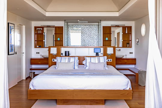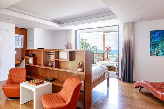 The luxurious holiday house LAO in St-Barths has three beautiful air-conditioned bedrooms, each of which is on a different level for utmost privacy. They all offer a beautiful view over the tropical environment and the ocean, and are furnished with king size beds with warm, soft and comfortable textiles. All three rooms have an en-suite bathrooms and access to a private terrace. For sport lovers, an air-conditioned fitness room and a jacuzzi are also available.