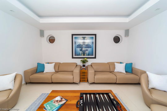 Built in a contemporary style, this three-level house opens onto an outstanding panorama, as the architects felt inspired by the exceptional beauty of the place. The modern and harmonious decoration is bright and southing, coming with soft neutral tones for a most pleasant escape. Enter the splendid holiday villa LAO in Corossol, and get struck by the timeless beauty of its sleek and high-standard furniture. Sofas with soft fabrics, armchairs and cushions are there for times of relaxation facing the terrace with a breathtaking view over the ocean. The dining room comes with a beautiful table that can accommodate up to six guests, for delicious moments enjoying the dishes prepared in the well-equipped kitchen with a breakfast bar. The relaxing white and taupe colors combined with the transparency of the glass elements create a pure and peaceful atmosphere. Close to the lounge area, you will find the TV corner, where you'll love enjoying movies in utmost privacy, comfortably seated on the sofas. At the back of the house, a water wall brings freshness and romance.