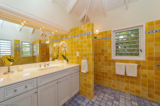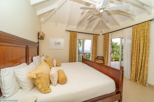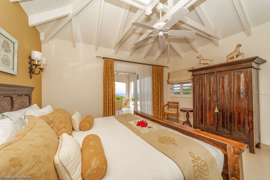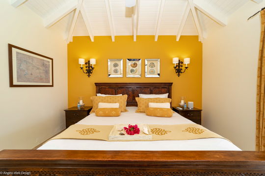 At the front of villa MARACUJA, the infinity swimming pool sparkles under the island sun. In a lovely environment with lush vegetation and bright view over the crystal-clear waters of the lagoon, there are comfortable loungers for pleasant reading or sunbathing sessions. Under the covered part of the terrace, a romantic outdoor lounge and dining area for eight guests are set up for al fresco evenings in the gentle Caribbean. On the lower level, the tropical garden creates an idyllic scenery with green lawn, lounge nestled under an ajoupa and natural pond. Facing the deep blue horizon, the setting is romantic and paradisiac, like a dream come true.