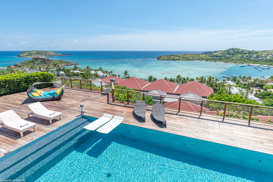 Rental villa in St. Barths NALA is a beautiful property nestled on a hill above Grand-Cul-de-Sac. This five-bedroom vacation rental is located only a few steps from the beach and water activities, a perfect place for a large family or group of friends vacationing together in Saint-Barts. Built in a Caribbean style and facing the panoramic view over the clear-crystal lagoon of Grand-Cul-De-Sac, vacation home NALA was recently renovated by its new owners.
