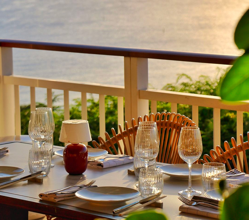 At the front of the villa, the terrace is elegantly furnished with outdoor lounges, sofas and comfy chairs around the large heated infinity swimming pool. A bar with stools connects the kitchen, allowing guests to sip a cocktail or to talk over a coffee in the mild air. Under the covered area, the lovely dining table for twelve guests is set up for delicious al fresco meals, facing the breathtakingly beautiful view over the waters of St. Barths. In the evening, you'll be amazed by the wonderful sunsets over the ocean, before heading to the private disco with your friends.