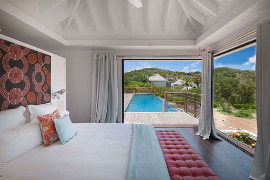 Pour un séjour à St-Barthélémy dans tout le confort souhaité, cette luxueuse villa de location dispose de quatre belles chambres climatisées avec vue sur le jardin ou la mer. Chacune est dotée d’un lit king size et d’une salle de bain attenante. Deux suites sont situées de part et d'autre du grand séjour, une troisième au niveau de la piscine, donnant sur la terrasse, quand la dernière chambre est située dans un bungalow indépendant. Entre coussins et textiles cocon, la décoration contemporaine et minimaliste ajoute à la sensation de détente.