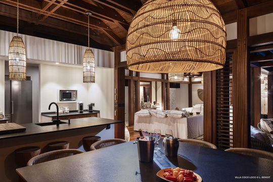Décoré avec goût dans un style balinais fait de nombreuses boiseries et de tons chaleureux, le salon de la villa COCO LOCO vous accueille dans ses confortables canapés recouverts de coussins et autour de son mobilier patiné. Plancher, tapis, osier et lumières tamisées participent à créer un espace original et chaleureux. De là, la vue est époustouflante avec, au premier plan la piscine en semi-intérieur, et au loin la baie et l’océan. De l’autre côté de la pièce, se trouve une jolie table carrée qui accueille jusqu’à huit convives sur de confortables fauteuils tressés. La cuisine située en arrière de la salle à manger vous permettra de préparer de succulents repas, avec son équipement électroménager très complet et son îlot surmonté de suspensions en osier qui rappellent l’esprit balinais présent partout dans la villa.