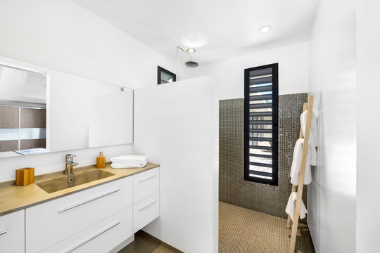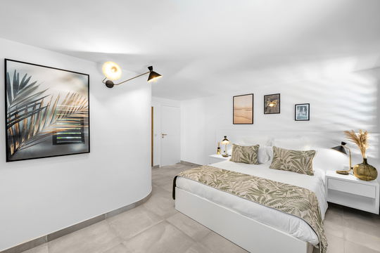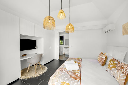 La villa de location CRUSH est composée de quatre chambres climatisées avec salles de bains attenantes. Elles sont meublées de lits queen size dans un décor clair et épuré propice au repos. L’une des chambres se situe dans le bâtiment principal, et les trois autres donnent sur la piscine de la propriété. À l’étage, vous aurez accès à la salle de sport via un escalier intérieur se fondant dans le décor de la charpente blanchie.