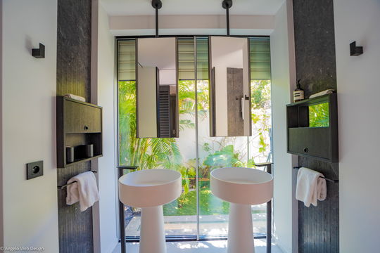 La villa de location saisonnière DOMINGUE est composée de trois chambres climatisées avec salles de bains attenantes, la master possédant une douche extérieure supplémentaire. Situées à l’étage, elles ouvrent sur des vues magnifiques sur l’océan et sur la végétation de St-Barths. Très privées, elles disposent de grands lits, d’espaces bureaux et de téléviseurs HD. Les coussins moelleux, les vues magnifiques et l’atmosphère feutrée vous plongeront dans un état de bien-être propice à l’émerveillement.