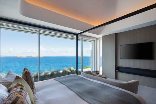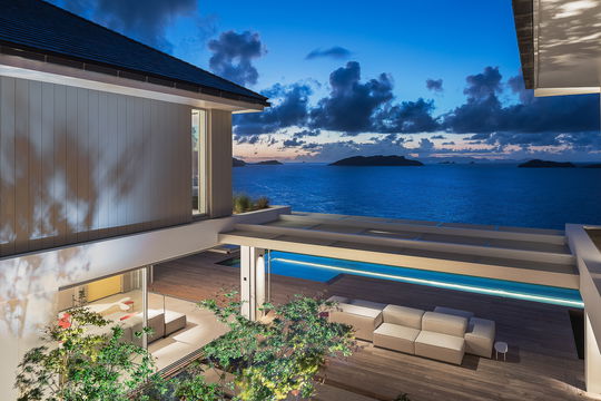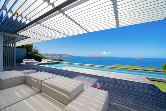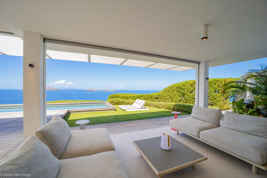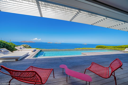 Face à un panorama unique, la villa de location DOMINGUE est le lieu parfait pour un séjour luxueux à six personnes à St-Barths. Cette propriété peut également être louée avec la villa BELAMOUR (1 chambre), pour former un complexe pouvant accueillir huit personnes, BEL ESTATE.