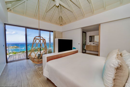 Sur la terrasse, vous serez subjugué par la beauté de la piscine chauffée à débordement semblant se fondre avec l’océan et l’azur. La vue sur le port constellé de bateaux en contrebas et sur l’horizon infini est saisissante de beauté. Une chaîne hi-fi, de nombreuses chaises longues ainsi qu’un canapé extérieur relevé de coussins rouge corail sont élégamment disposés dans ce vaste espace pour des moments exquis de détente sous le soleil des Caraïbes. L’endroit idéal et juste parfait pour contempler, chaque soir, le spectacle inouï des couchers de soleil de Saint-Barths.