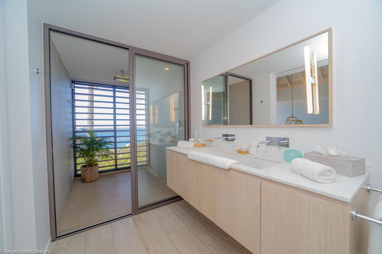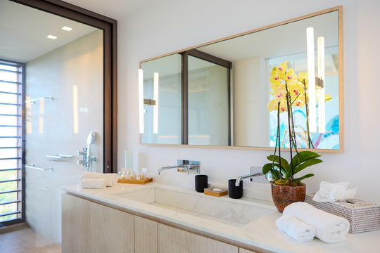 Entrez dans le séjour moderne de la luxueuse villa D’ZIR et installez-vous confortablement sur les immenses canapés et banquettes recouvertes de coussins moelleux. Murs blancs, tons clairs, dans un décor minimaliste et épuré : le mariage des éléments participe à créer une atmosphère de sérénité face au spectacle au dehors. De là, la vue sur l’océan et la baie est majestueuse. Un grand mur en bois permet d'ouvrir le séjour avec téléviseur à écran plat avec satellite américain et Apple TV, pour le relier à la cuisine parfaitement équipée. Elle dispose d'un bar à petit-déjeuner pour les encas à toute heure de la journée, et d’une cave à vins. Sous un plafond voûté créant une délicieuse sensation de volume, la grande salle à manger est installée à côté de la terrasse pour des repas face à l’horizon azur, et peut accueillir autour de sa table jusqu’à dix invités.