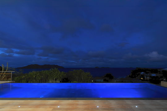 Autour du salon climatisé, se dessine une belle terrasse permettant aux hôtes de profiter de la brise rafraîchissante et de la vue magnifique sur l’océan. Au niveau inférieur, une belle piscine chauffée à débordement se déploie face au panorama de l’océan infini. Des chaises longues et un joli salon d’extérieur complètent l’aménagement, pour un confort et une détente absolus dans le calme charmant de l’île.