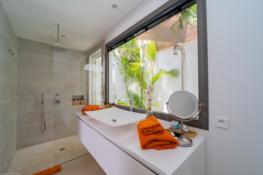 La villa de location saisonnière ETJ est composée de trois chambres climatisées avec salles de bains attenantes et d’une douche extérieure. Situées à l’étage du bâtiment à l’arrière du salon, elles sont meublées de lits king size et disposent de dressings spacieux. Toutes trois ouvrent sur un balcon avec plancher en bois encadré de palmiers au feuillage ciselé. La décoration est douce, avec des coussins soyeux et des tons clairs entre sable et blanc.
