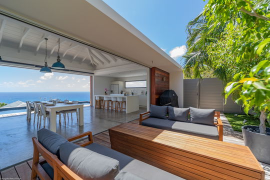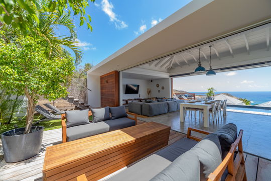 La terrasse située à l’avant offre un panorama splendide avec les eaux scintillantes de St-Barths à perte de vue. Près de la piscine chauffée, des transats ainsi qu’un confortable salon extérieur sont à votre disposition, l’endroit rêvé pour se relaxer et profiter de la beauté caribéenne. À l’arrière du bâtiment principal près de l’escalier extérieur qui permet d’accéder aux chambres, vous trouverez un deuxième salon extérieur en bois dans une ambiance cosy et chaleureuse rehaussée par les plantes luxuriantes. Dans la douceur de l’air des îles, l’heure est au repos et à la détente au cœur d’un environnement privilégié, face à la vue sur l’océan à travers le salon.