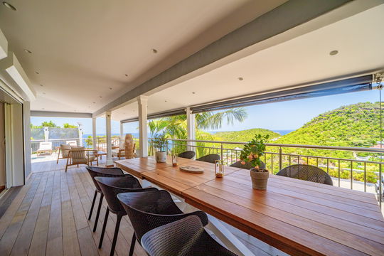 La terrasse de la villa LENALEE dispose d’une partie couverte abritant une deuxième salle à manger al fresco pour huit, parfaite pour dîner dans la douceur des alizés. Un salon extérieur confortable avecfauteuils recouverts de coussins blanc cassé et table basse se situe également sous cette partie ombragée d’où la vue sur l’océan est stupéfiante de beauté. Sur le côté se trouve une belle piscine couleur lagon surmontée d’une cascade aux allures de prisme naturel. Tout autour du bassin sont aménagés des bains de soleil recouverts de coussins, parfaits pour se relaxer ou siroter un cocktail. Face à l’horizon, la beauté de St-Barths fusionne avec le scintillement de l’océan, sous un ciel d’un azur profond.