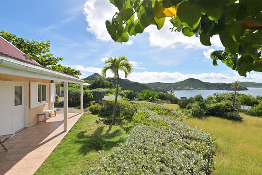 La terrasse de cette charmante maison de vacances est une ode à la beauté de Saint-Barths : un confortable salon de jardin meublé de canapés blancs est aménagé sous la partie couverte, lieu privilégié pour admirer le panorama saisissant de la baie de Saint-Jean. La végétation tropicale encadre la vue de ses feuillages ciselés, entre fraîcheur végétale et beauté de la nature. Située à l'arrière de la propriété, la jolie piscine est entourée de chaises longues, lieu intime et propice au repos, pour des moments de lecture ou de conversation sous le soleil de Saint-Barths.