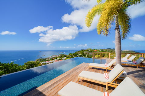 La terrasse ouvre sur une vue panoramique d’une beauté à couper le souffle. Face à la ligne d’horizon, se déploie une grande piscine chauffée parfaite pour nager ou se rafraîchir alors que le soleil de St-Barths inonde généreusement les transats confortables et lits de jour. Un salon extérieur avec canapés, fauteuil et luminaires de style contemporain se trouve en bord de terrasse, l’endroit rêvé pour siroter un cocktail le soir face au spectacle changeant de l’océan. Un peu plus loin, une jolie pergola en bois filtre les rayons du soleil, pour une expérience idyllique face aux éléments naturels de St-Barths. Un deuxième salon extérieur avec banquettes est également à votre disposition. Luxueuse et élégante, cette terrasse est le lieu parfait pour admirer les levers et couchers de soleil, peignant une lueur contrastée dans le ciel caribéen.